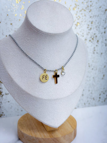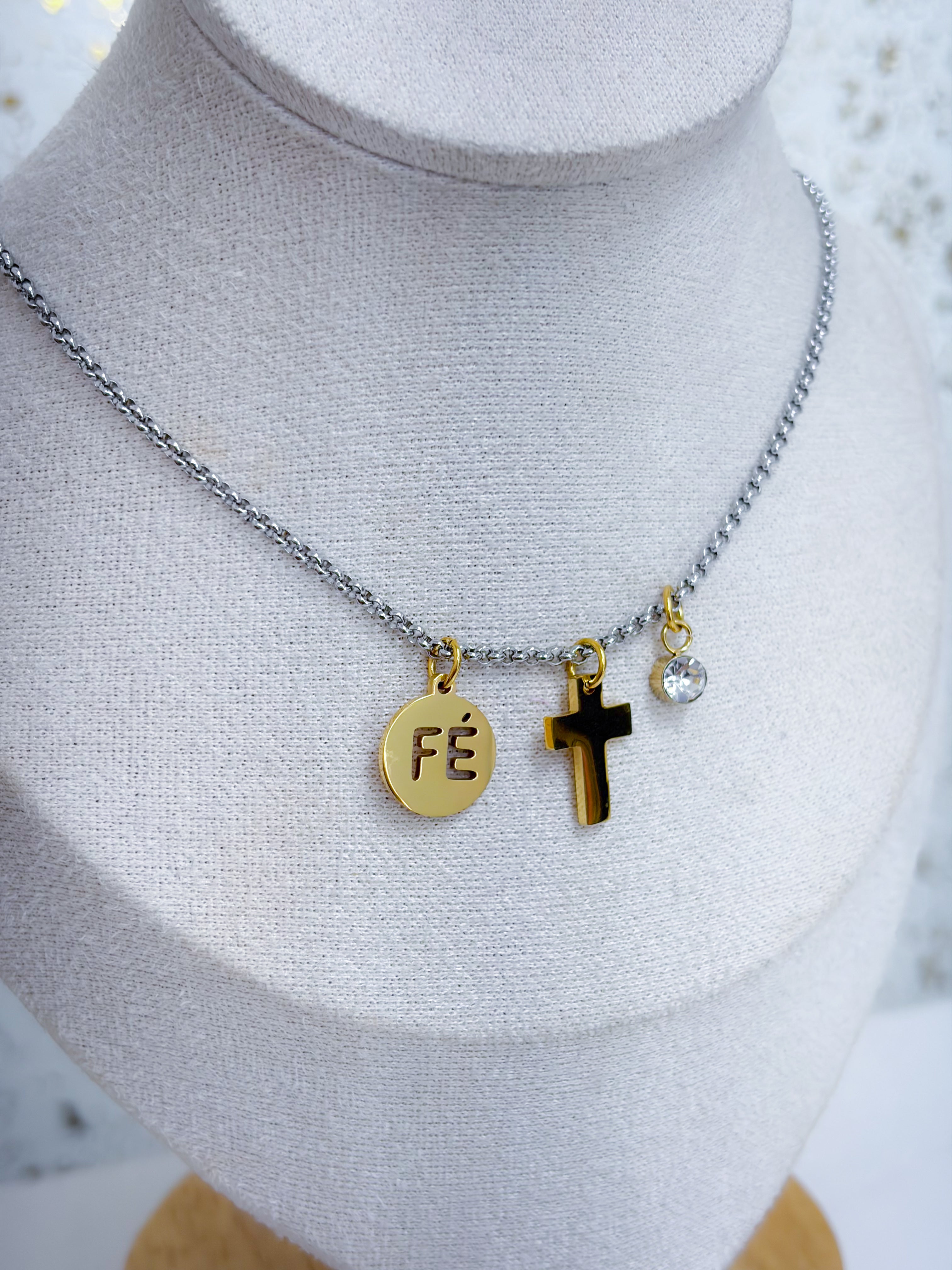 Un diseño moderno y delicado con tres charms metálicos que añaden brillo y detalle al look. La cadena tiene un acabado pulido y liviano, perfecta para uso diario y para combinar con otras piezas. Fabricada en stainless steel, resistente al agua y al desgaste, manteniendo su color y brillo con el tiempo.