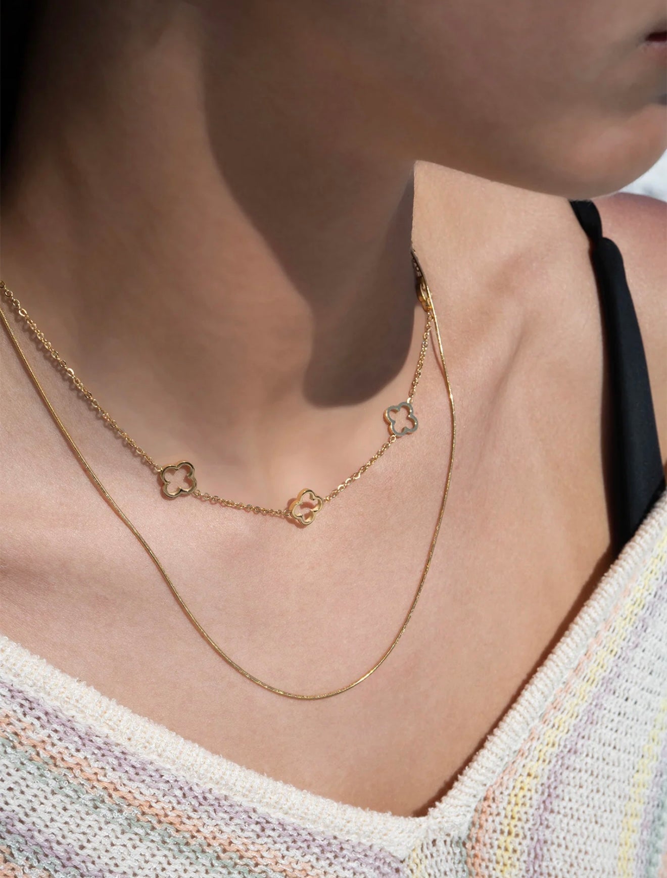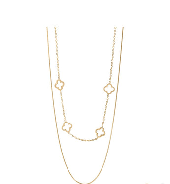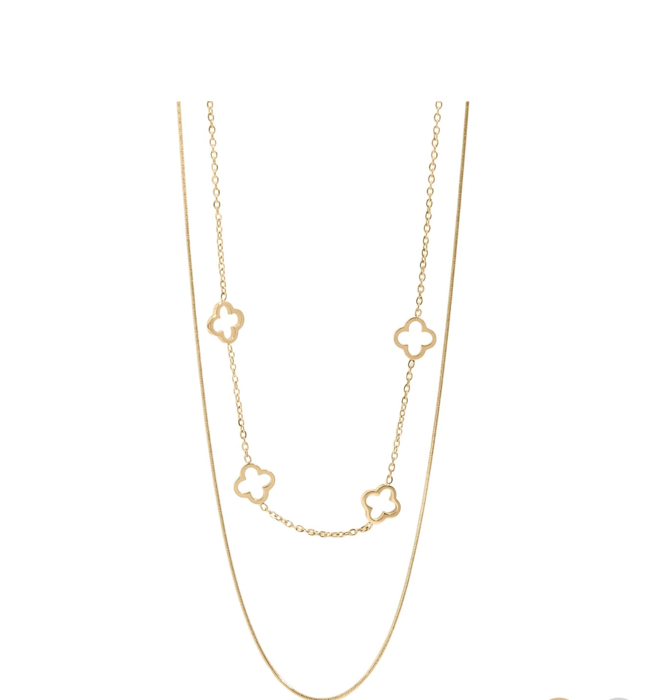 This new trending necklace design is perfect to accent any outfit. Featuring four gorgeous clover designs and a second hanging chain for a layered look. our necklaces are made from 18K Gold PVD Stainless Steel and will never tarnish, fade, or turn your skin green! Get your clover necklace while they last!