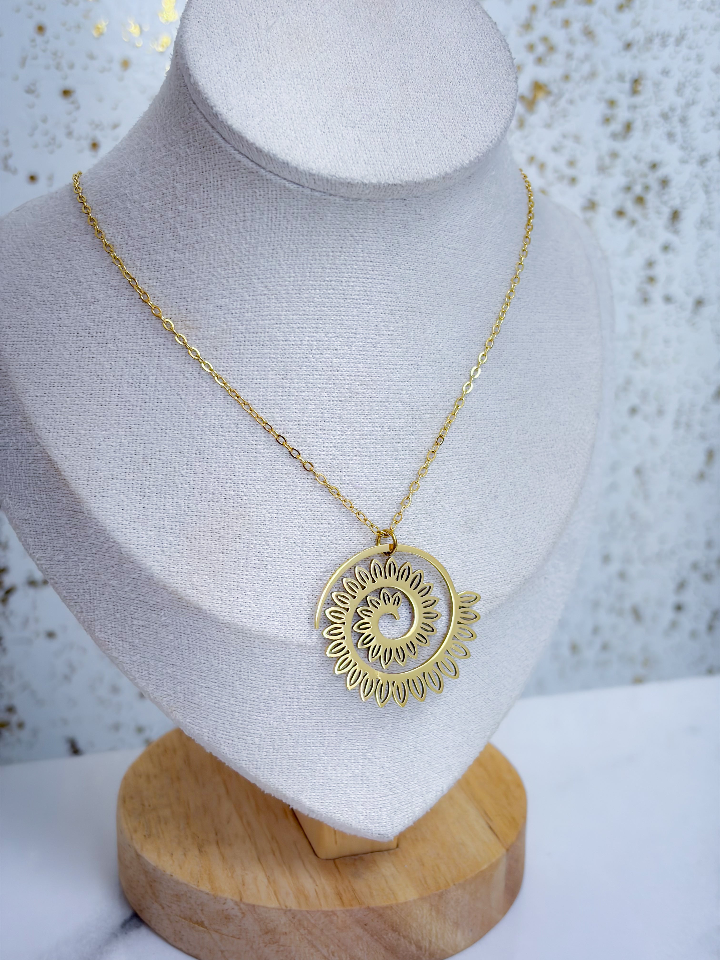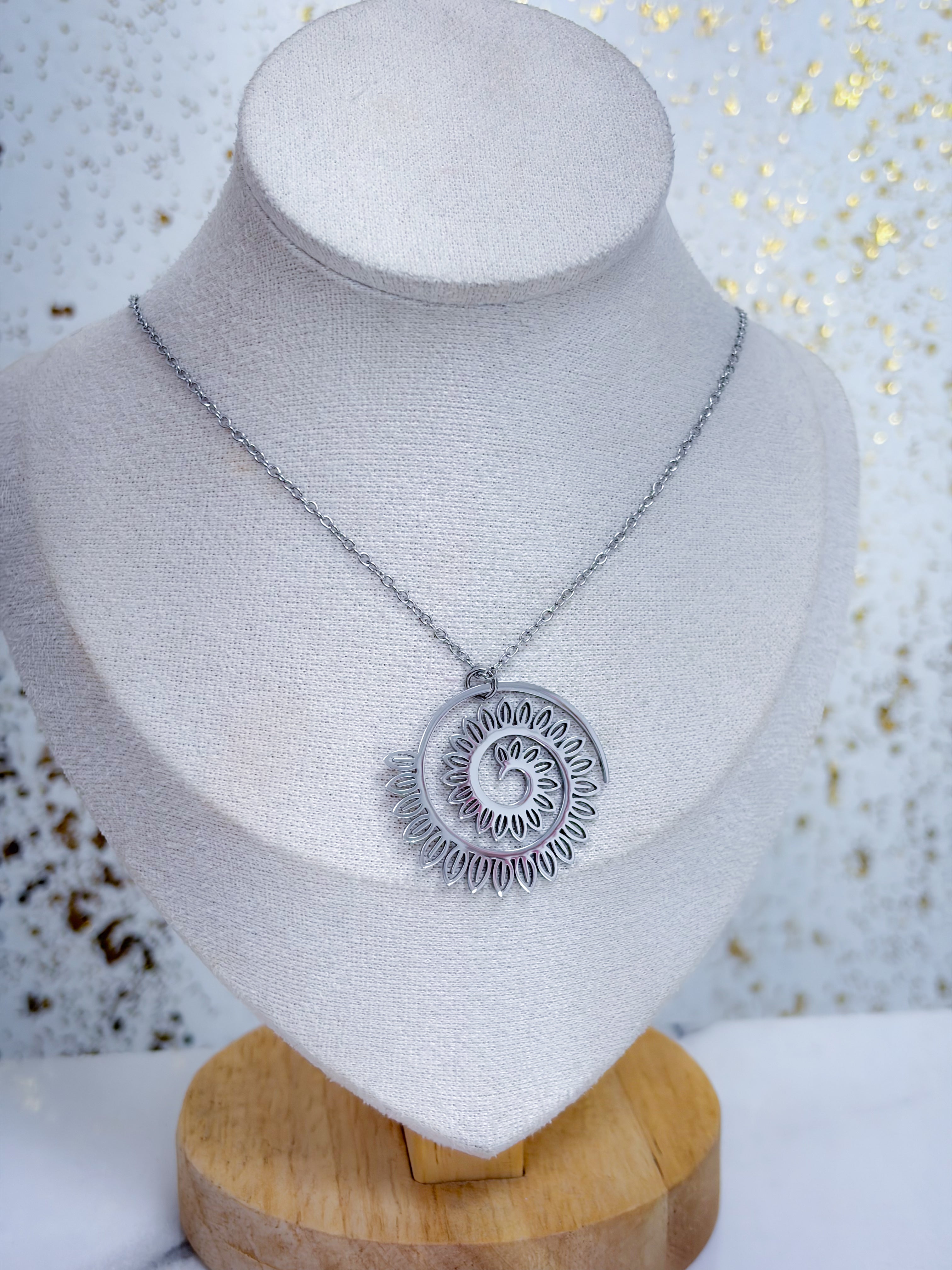 Un diseño llamativo y lleno de estilo. Radiant Spiral destaca por su forma en espiral con detalles tipo pétalos que enmarcan un corazón central delicado. Es una pieza ligera, moderna y perfecta para usar sola o en capas.
