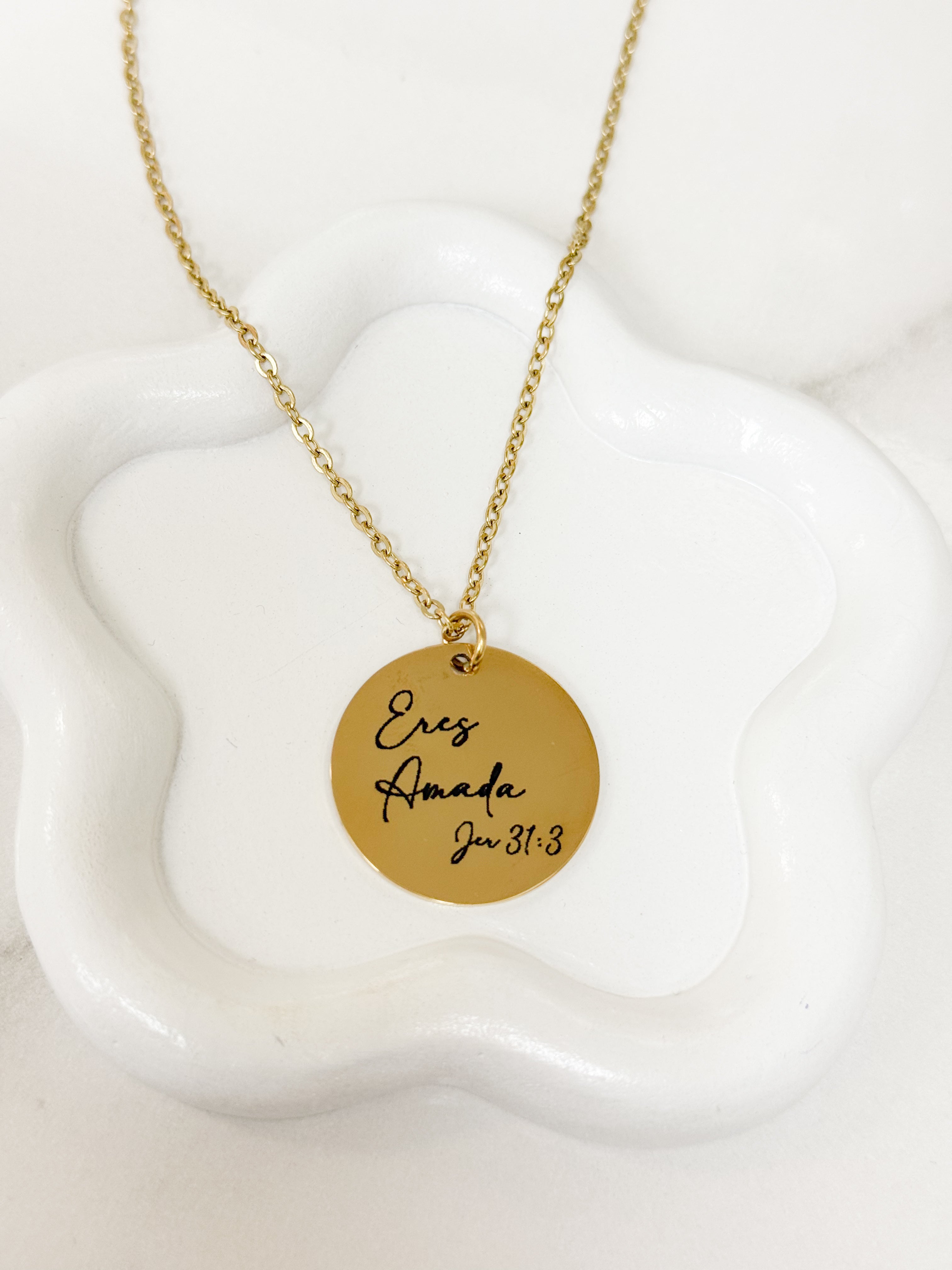 Con su inscripción inspirada en el concepto bíblico de ser profundamente amada y valorada, esta pieza no solo complementa tu estilo, sino que también te inspira a recordar quién eres y el amor que te rodea.