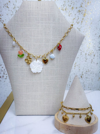 La cadena presenta charms de diseño único —una mezcla de corazones, trébol, perla y detalles de color— que aportan un aire alegre y sofisticado. La pulsera complementa con delicadas esferas y corazones dorados, creando el balance perfecto entre dulzura y estilo moderno.