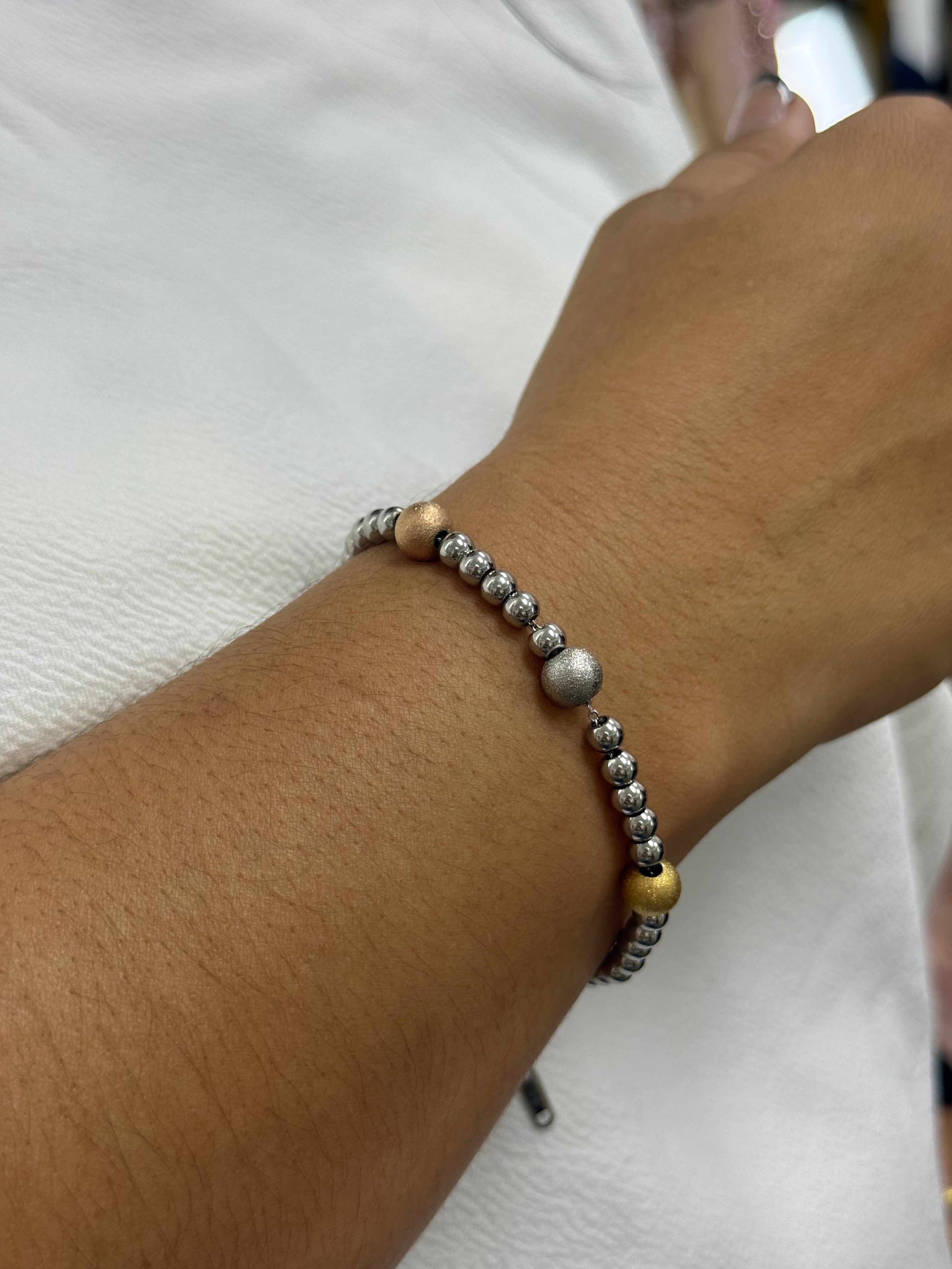 Pulsera elegante y versátil con acabado brillante que aporta un toque moderno a cualquier look. Elaborada en acero inoxidable de alta calidad, resistente al agua, al sudor y al uso diario sin perder su color ni brillo.