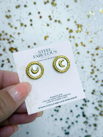 Minimalismo con un toque celestial. Las Pantallas Luna Dorada combinan un diseño circular con borde texturizado y una delicada media luna dorada al centro, creando una pieza moderna y sofisticada.