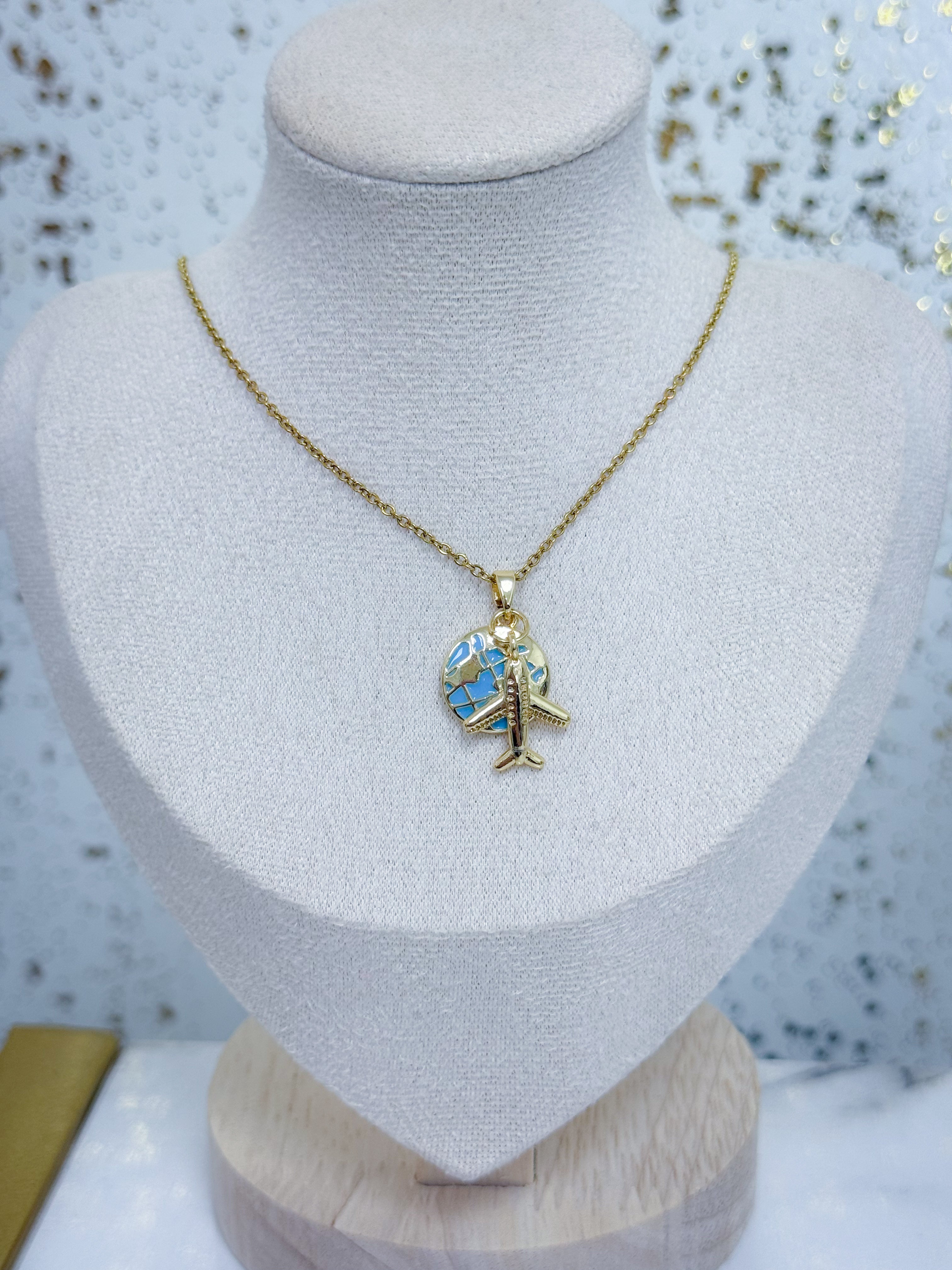 Nuestro collar “Viaja con Propósito” combina un dije de avión con un pequeño globo terráqueo en tonos azul cielo y dorado, recordándote que cada destino tiene un propósito.