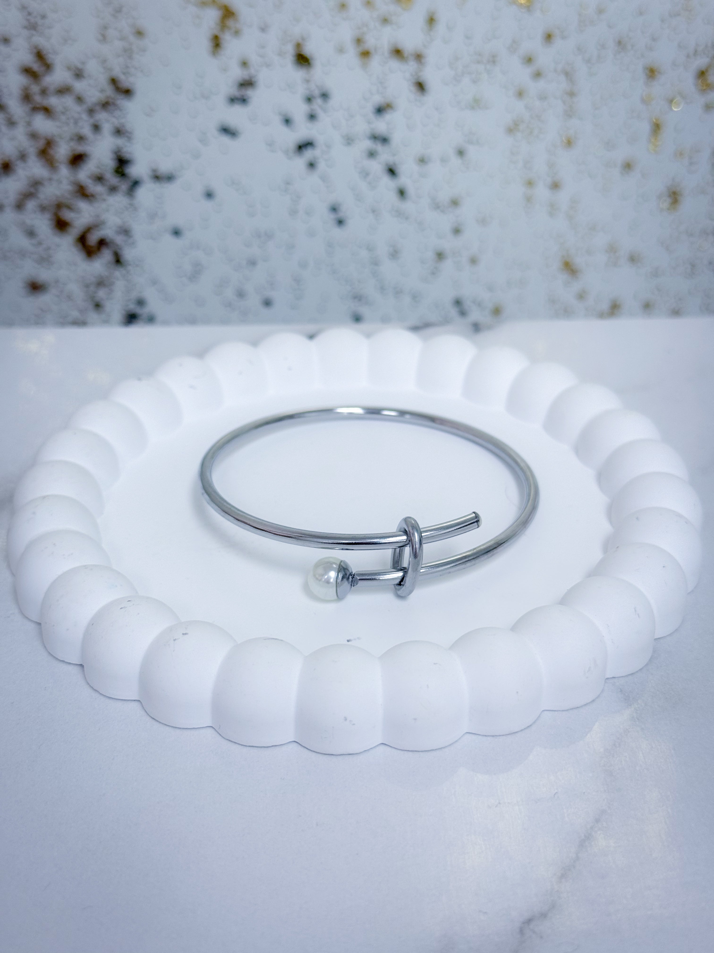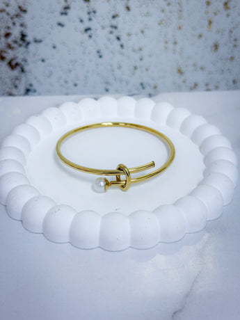 Un diseño minimalista con un toque de sofisticación. Su estructura dorada pulida se combina con un delicado detalle de perla en el extremo, creando el balance perfecto entre modernidad y elegancia.